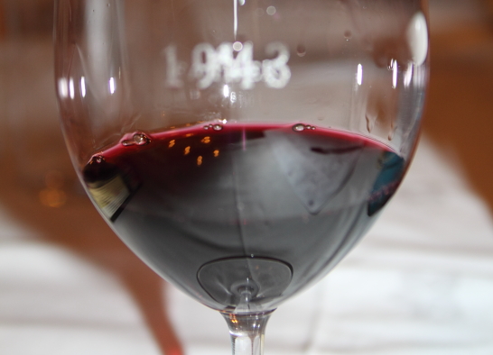 Fase visual: Rojo cereza picota brillante y capa alta. Borde morado. Lágrima lenta y glicerinosa.